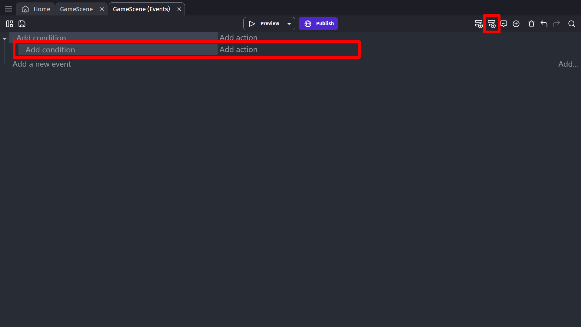 When you switch to the Events editor, you will see that the toolbar changes to display new tools: