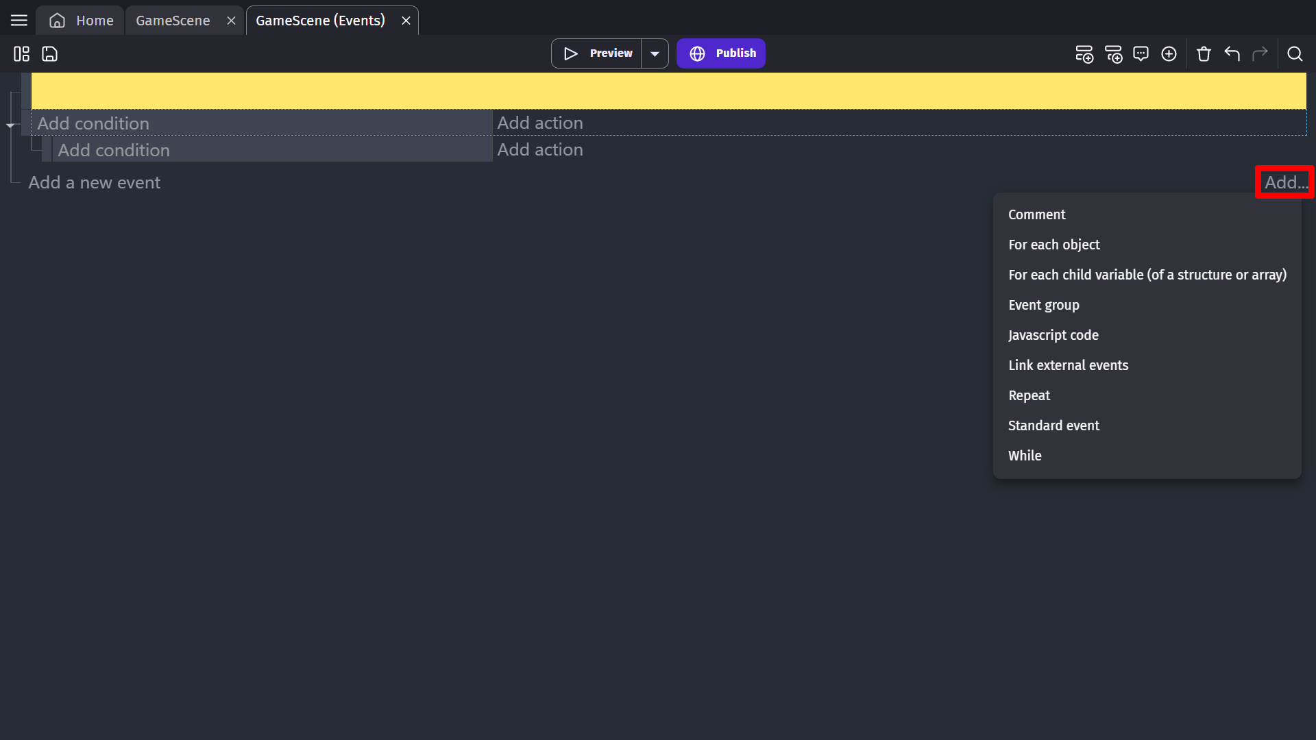 You can add any number of event blocks to the Event editor. Each event can have various conditions and actions. Once you add an event, you can use the conditions and actions to create the game's logic. Read more about conditions and actions.