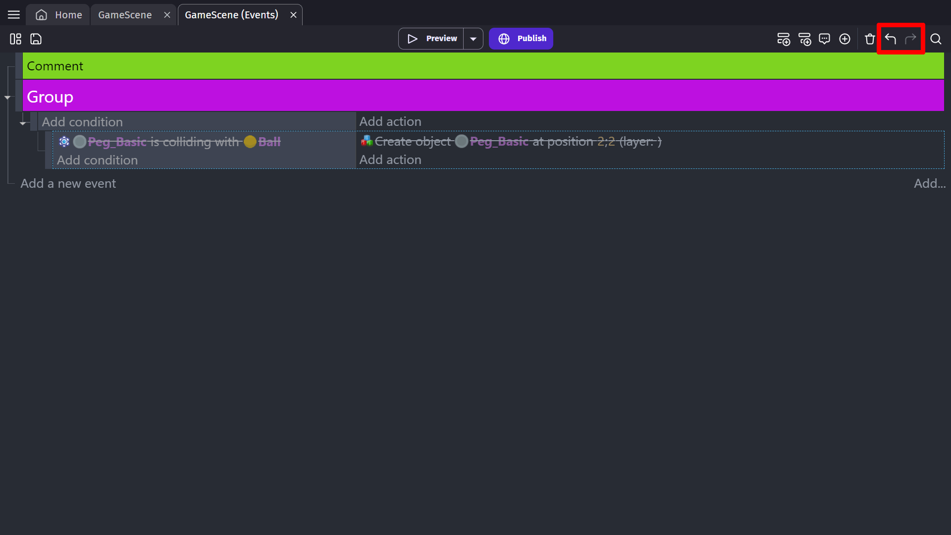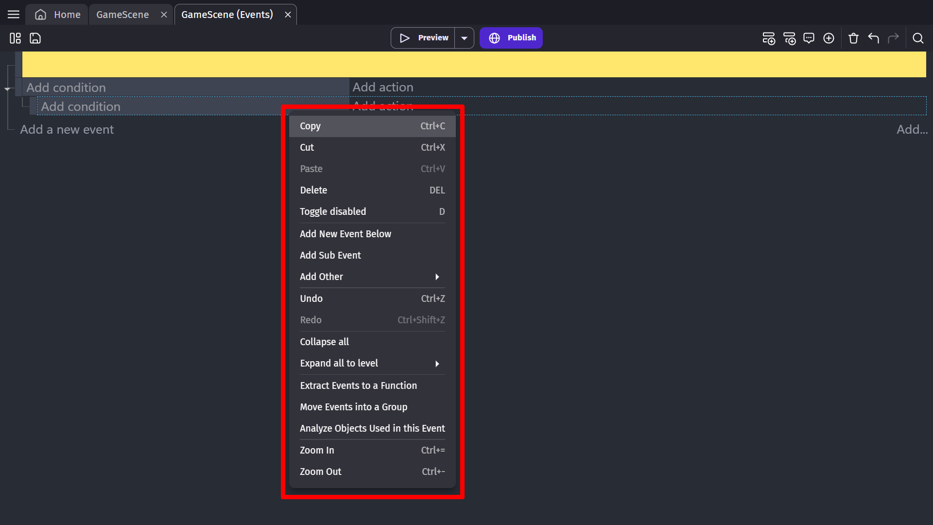 Disables the selected event and it's sub-events. When disabled, the event and all sub-events will be ignored while the game is running. The disabled events will have strike-through text on the actions and conditions.