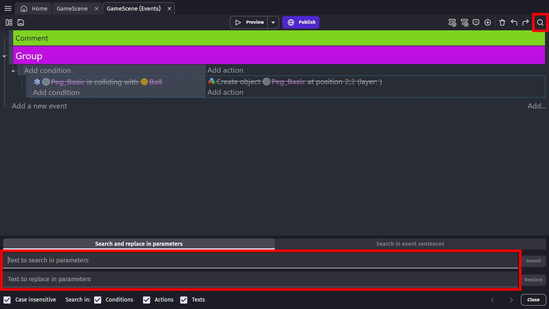 The "search in events" button opens a panel at the bottom of the screen. You can search for a specific term in the parameters of the conditions and actions. You can also enter a replacement parameter and replace all the occurrences of the text in the events.