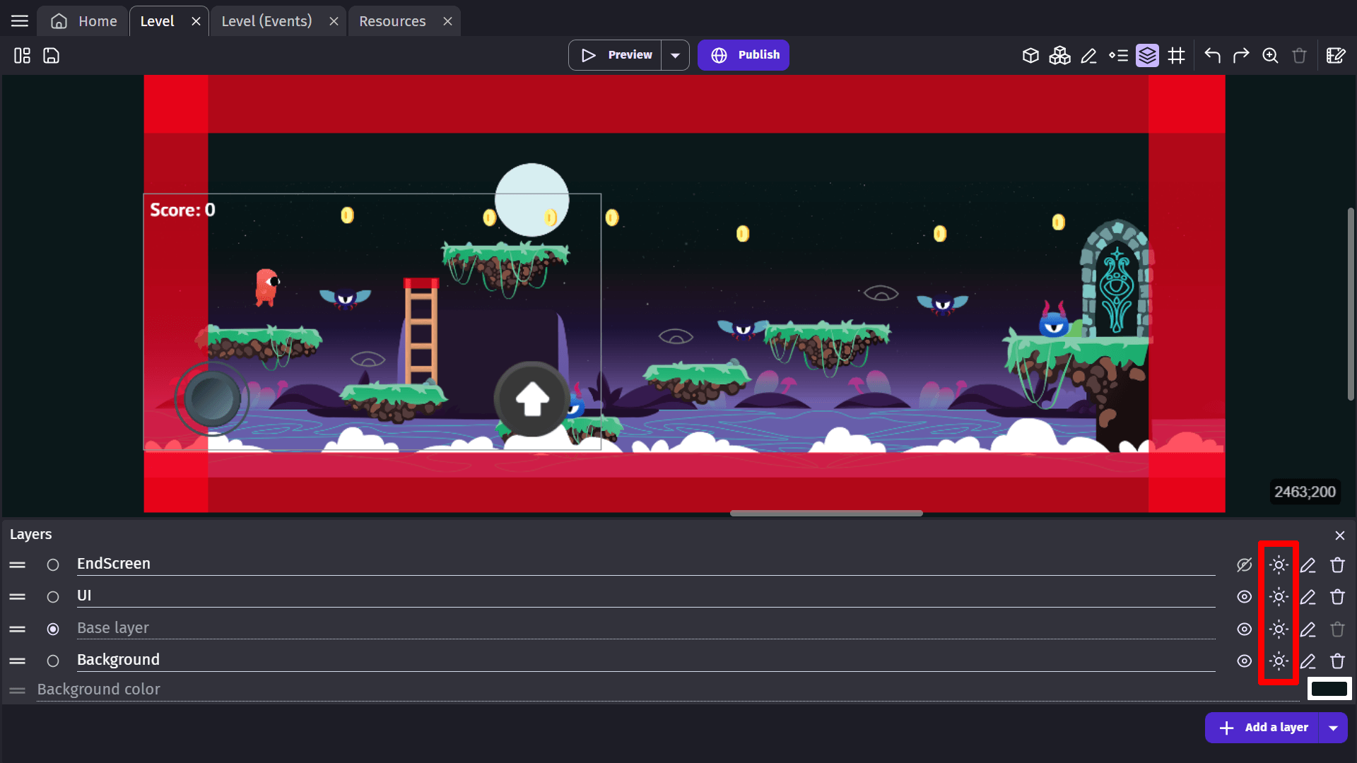 Using events, you can manipulate a layer effect's parameters during the game. It can be useful for different situations: a day-night cycle, a flashback effect, etc...