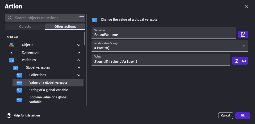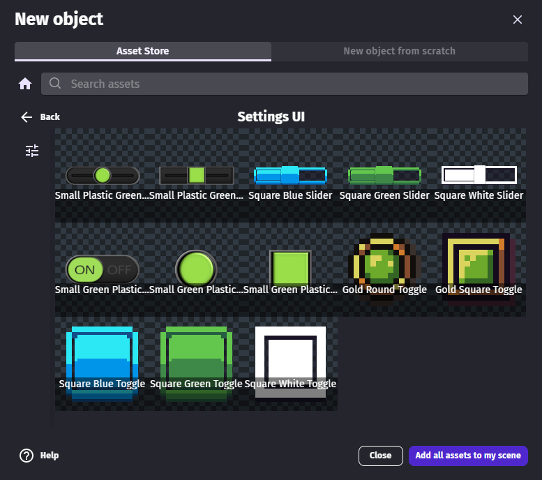 Sliders and toggle switches can be useful to make a settings panel. As the settings panel and the game may be in different scene, the value can be stored in a global variable to use it in other game scenes.