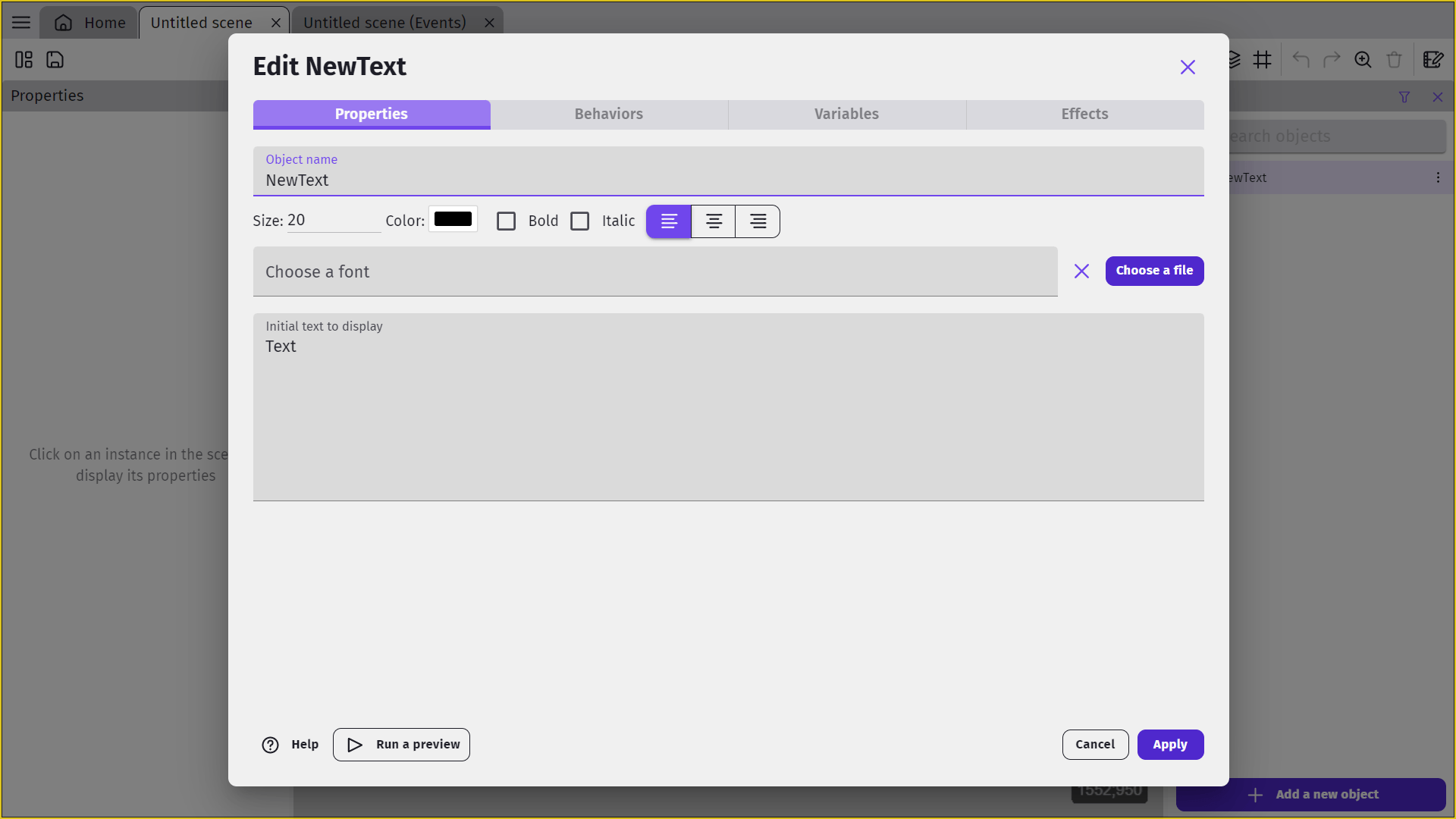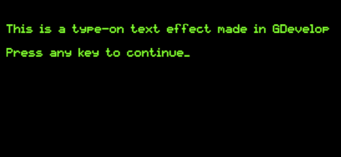 Text objects are used to display text on screen. You can customize the properties of a text object (for example, font size or colour) when you create the object. You can also modify the properties of a text object during gameplay using events.