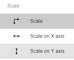 - Scaling of the object can be changed. There are three options: "Scale" (constrains proportions to scale on both X and Y axis), "Scale on X axis" (width), and "Scale on Y axis" (height).